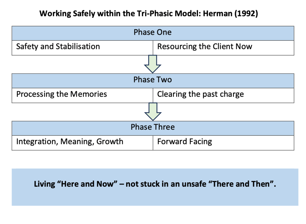 In Phase One we work consciously using a combination of Psychoeducation – knowing what happens in the body and brain, being able to see your coping strategies as symptoms, practising how to stay safe in your body.